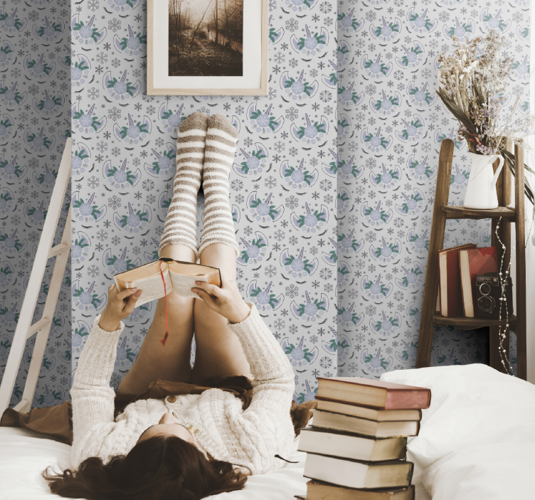 私たちの花 壁紙 心地よい花の隠れ家は、ユニコーンや雪片、フラワーズが美しくデザインされた心地よい空間を演出します。リラクゼーションをテーマにしたこの壁紙は、居心地の良い本を読む時間をさらに特別なものにしてくれます。装飾的な要素がふんだんに取り入れられており、インテリアに華やかさをプラスします!
